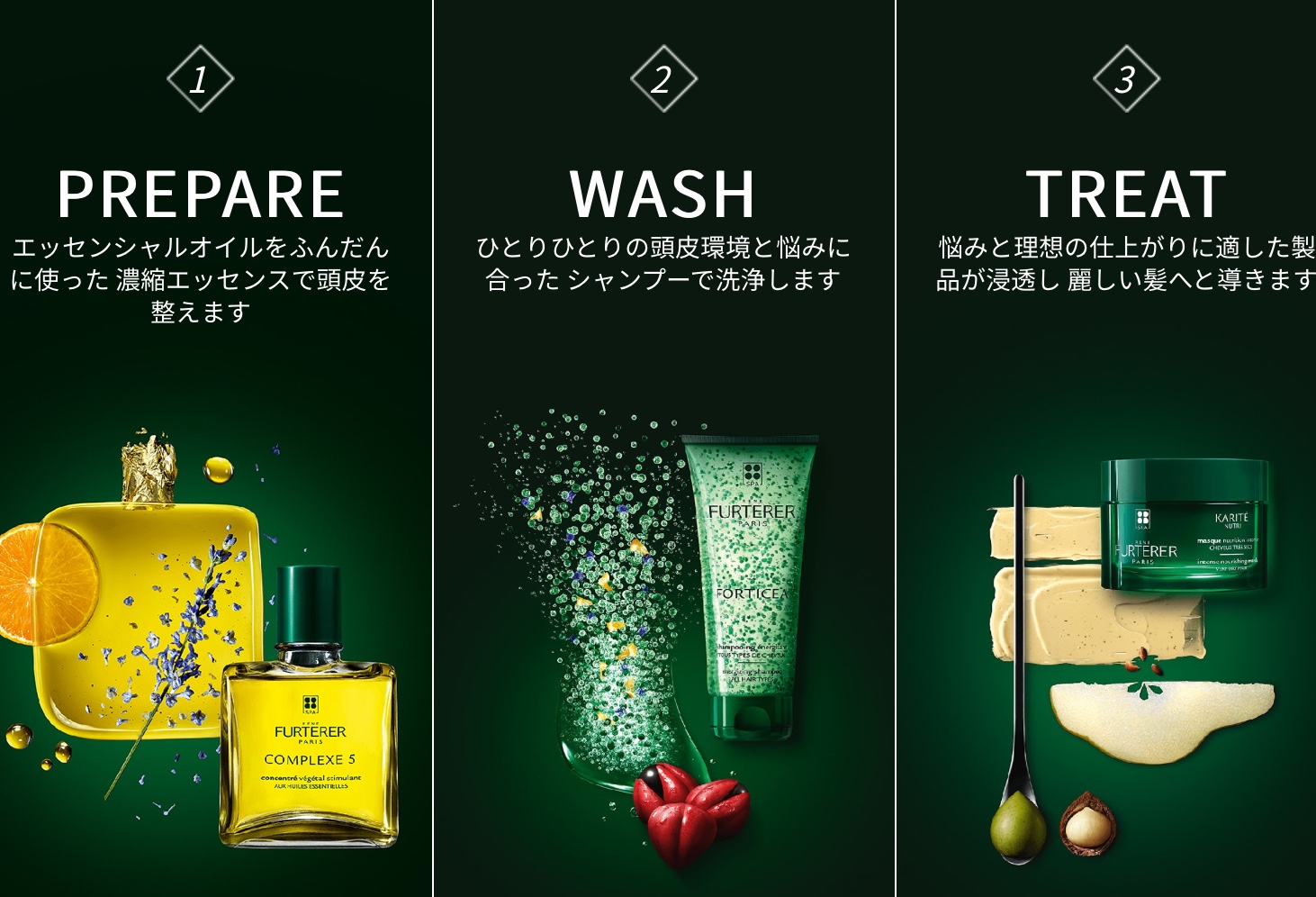 ルネフルトレール独自の「プリペア」「ウォッシュ」「トリート」の3ステップに基づいた美しい髪の土台である健康なスカルプを育みます。