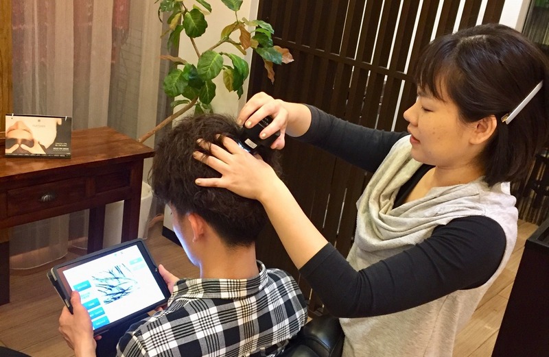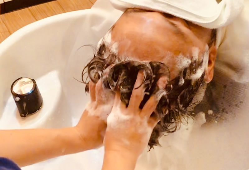 コンプレックス 5や、アステラフレッシュフルイドなどのエッセンシャルオイルがふんだんに使われたスカルプケアオイルでマッサージ。頭皮を柔らかくし、血行やリンパの流れをよくして、この後に使うケア剤の浸透を高め効果を促進します。